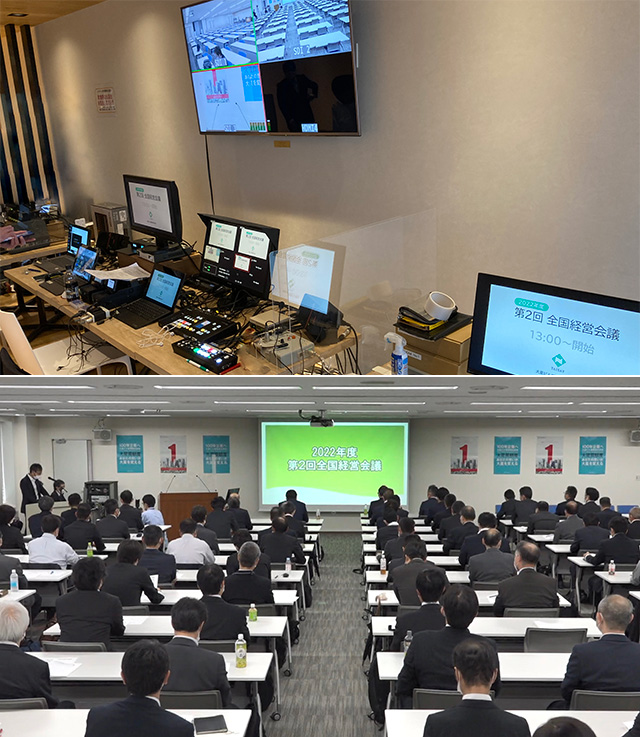 新型コロナウイルスの感染対策が求められる中、本社で行われた経営会議・表彰式の模様を館内複数の会議室へ中継するとともに、国内各支社へ向けてインターネットライブ配信を行いました。